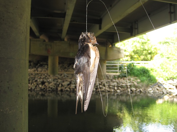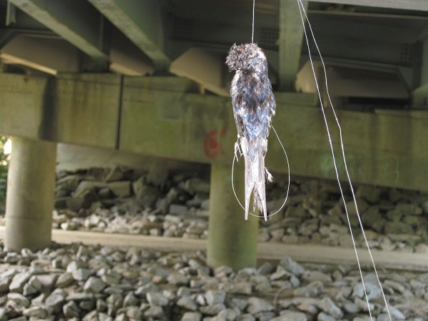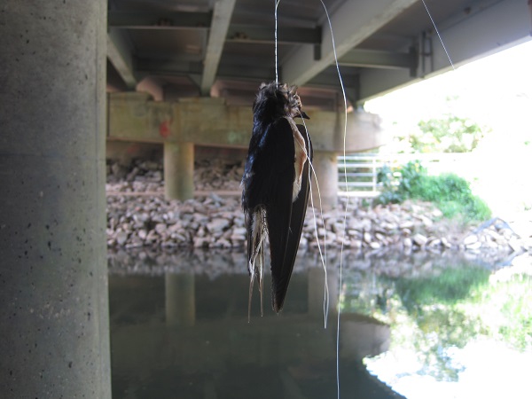 Fisherman, take it home! The sad and macabre end of a cliff swallow, tangled in discarded fishing line and caught dangling under the Little River Turnpike bridge over Accotink Creek. A small colony of swallows has nested under this bridge for years, delighting passersby with their graceful gliding flight over the water and the marvel of their tidy nests constructed of balls of mud. Or delighting almost everyone, it seems, for sadly we have seen recent signs of rock throwing directed at the nests.