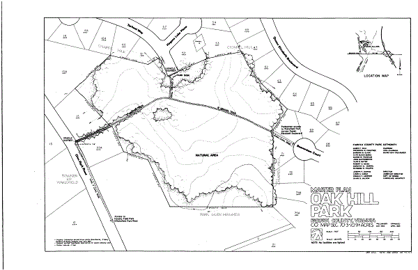 When my wife and I moved to The Chapel Hill Neighborhood in Annandale in 2011, I found a stairway leading into the woods at the end of Beaverdam Court. There were park signs under overgrown trees and shrubs that were rotten and falling down yet marked the area as a Fairfax County Park. Neighbors bordering the park had been dumping yard debris at the trail head and most of the trail had been blocked by numerous fallen trees. The neighbor at the Tarheel Way trail head had been cutting the field at the trailhead and claiming the park as a private "green space" behind his property in the name of neighborhood safety. The large red and yellow wooden park sign at the trailhead was covered by a tree branch which was conveniently left in place to hide the sign and keep park patrons from discovering the area was indeed a Fairfax County Park. Numerous calls and emails to the Park Authority were met with the answer that there were no funds for the park. Photos sent via email to numerous recipients motivated the Park Authority to replace the two signs over a two year period. Fall 2013, I met with a park manager who indicated he would try to do something but no promises. Finally, June 2014 Fairfax County Park Authority, with prompting from the Braddock Supervisor, brush cut the trail between Beaverdam Court and Tarheel Way. The trail between Tarheel Way and Glen Park Road remains closed. The park maintenance supervisor stated he would only open it if neighbors on the Glen Park Road side insisted. Most of those neighbors likely don't know the park exists as there are no signs on Glen Park indicating it is a trailhead and it is overgrown, however one man on that side has told me he has been trying to get it reopened for years and will try once again. Oak Hill Park is named for historic Oak Hill Mansion, separated by Wakefield Chapel Road, but less than half a mile apart. There is a home in our neighborhood that is rumored to have been the slave quarters for the mansion and there is an unmarked cemetery up the hill from the home and currently between two homes on Hogans Lake Place in front of Oak Hill Park. The cemetery is marked on the park Master Plan by an "X". Glen Erickson Bell - August 8, 2014