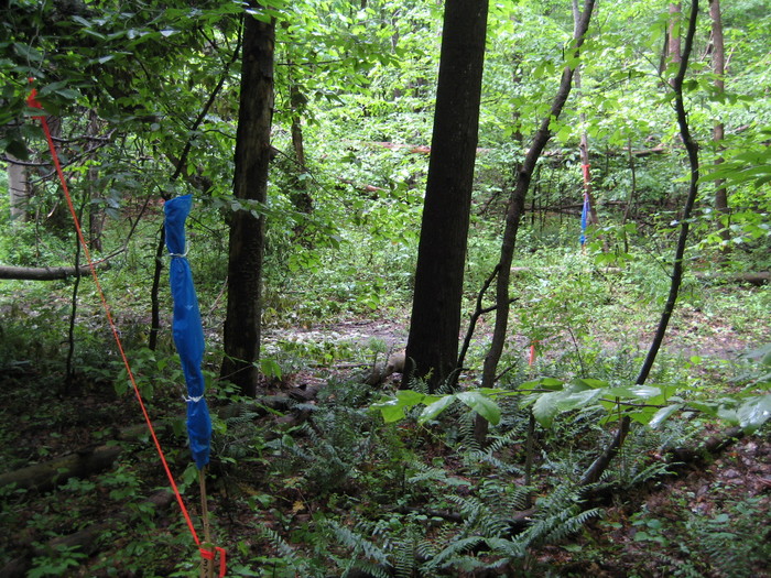 Here are some "during" photos. The blue stakes were placed to make the location of surveyor's stakes more visible in the photos, showing the location and width of the path marked for clearing.