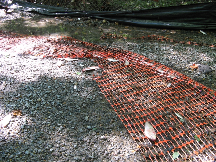 On September 7, I went back and photographed the damage. Downed trees were all along the creek and some along the trail. Most of the new culverts suffered serious damage. The silt fencing and the orange net fencing were severely damaged. Some of this washed away and became deadly debris downstream. The most shocking of all sights was that hundreds of fish were dead on the trail and dozens or hundreds more were trapped in puddles and blocked culverts or were caught in the temporary fencing. I couldn't walk down the trail without watching where I stepped so that I did not step on a fish! This was over a section a mile long. I did not walk the other mile, which I hear was worse. The fish were trapped because of the fencing and raised grading of the trail.