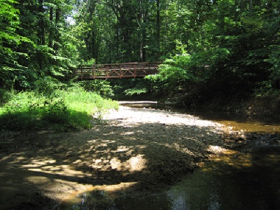 16 June 2014: Walked upstream from the mouth of Long Branch central in Lake Accotink Park to its last accessible upstream portion just south of Route 236 near Woodson High School. At its mouth in Lake Accotink Park, Long Branch has extensive forested buffer, but a treeless transmission line right of way crosses just upstream. A new U.S. Geological Survey stream monitoring station is located here, collecting a variety of water quality data. Upstream from Canterbury Woods Park, Long Branch flows through Long Branch Stream Valley Park with good forested buffer along its banks, although houses and mown backyards are too close in places. A stretch of gabion rock wall is located downstream from Woodland Way, shoring up the trail where it follows a narrow gap between houses and stream. As it crosses Woodland Way, Long Branch is within sight of Canterbury Woods Elementary School. Long Branch is contained within Long Branch Stream Valley Park for most of its length. Just upstream from Woodland Way, the nature of the forested areas along the banks is distinct, with beech trees comprising a much greater proportion than in other spots. The forest floor here is sandy and often clear of vegetation. There is evidence of abusive overuse by off-road cyclists. A prominent geologic band of black minerals is visible in the cut banks here and some other points upstream. An unnamed tributary enters Long Branch from the south here, flowing out of Red Fox Forest Park. Parts of this tributary have cut down to bedrock, which is mostly sandstone, with some large veins of white quartz. A power line cut crosses the tributary. In Red Fox Forest Park, the tributary has rather serious erosion problems. No fish were visible in the tributary within the park, despite steady water flow. There is little sign of human use in the park, with no footpaths or facilities. Considerable areas of the park are lacking understory growth. At Guinea Road, Long Branch's most significant tributary enters from the north, squeezing between the road and Rutherford Park. This tributary flows through a narrow strip of parkland from its origins in ponds on property of the Starlit Ponds Homeowners Association. Above Guinea Road Long Branch flows through Rutherford Park, where large areas are cleared for parking, playgrounds and sports facilities. Three pedestrian bridges cross Long Branch in Rutherford Park. An Invasive Management Area site is located here behind the tennis courts, where volunteers are working with the Park Authority to eliminate invasive alien plant species from dominating at least a small area. A small tributary that enters Long Branch from the south in Rutherford Park flows alongside this project area, and its banks are smothered in English ivy. Upstream from Rutherford Park, one finds many impressive fern glades along Long Branch. Forested buffer is still extensive within Long Branch Stream Valley Park along both banks. At Olley Lane, there is a gap in Long Branch Stream Valley Park and Long Branch Stream Valley Trail reaches its farthest upstream point. A detour of several blocks along the streets is necessary to resume walking upstream of the private lots here. A private pond on one of those lots is visible from Olley Lane. The Little Run Elementary School SACC program has adopted this portion of Long Branch, bordering school property, for regular trash cleanups through the Virginia Adopt-A-Stream program. Upstream from Olley Lane, a tributary joins from the south, and there is a neighborhood playground beside it. The tributary originates in Olde Forge Park, which shows little sign of human use, with no footpaths or infrastructure. Olde Forge Park has fairly good native flora, with Mountain Laurel and Arrowwood shrubs, and the uncommon Indian cucumber root and Ground pine moss, as well as large stands of mixed native ferns. Upstream from Olde Forge Park, the tributary originates in a stormwater pond on the property of the Korean Presbyterian Church. Upstream from the Olde Forge Park tributary, Pickett Road passes over Long Branch as a pedestrian-only bridge. Further upstream, the wooded buffer is interrupted by the clear cut along the petroleum pipeline. A drainage channel in the pipeline cut is showing some serious erosion issues. Olde Creek Elementary School borders Long Branch here in this portion of Long Branch Stream Valley Park. Starting at Olde Creek Elementary, a maintained trail runs alongside Long Branch before angling away from the stream in Smokewood Park. An oddity here is the number of oyster shells found in the stream, not some unknown species of freshwater oyster, but the discarded remains of someone's oyster feast, slowly washing downstream. Sadly, there is no sign of the native mussels that once must have thrived in Long Branch. Just downstream from Laurel Street, Long Branch flows through Smokewood Park within sight of Woodson High School/Frost Middle School and crosses one corner of Calvary Memorial Gardens. A sign in Smokewood Park indicates it has been adopted as part of Fairfax County's Adopt-a-Park program. A little bit upstream from Laurel Street, the source of Long Branch is inaccessible on private lots. The upper limits of the sub-watershed include a small area within the limits of Fairfax City. Other parks in the Long Branch central sub-watershed are: George Mason Park, Long Branch Falls Park, Surrey Square Park, Willow Woods Park, Red Fox Forest Park, Olde Forge Park, and Ashford East Park, Young "engineers" seem to favor Long Branch for training exercises, judging from the number of rocks placed in the stream as stepping stones or to construct tiny dams. Trash conditions are not bad along Long Branch, especially as compared to many other similar nearby streams. This may be due to the fact that nearly 100% of the sub-watershed is residential, with few of the commercial areas and major highways that are sources of trash. Fish are abundant along Long Branch, even its uppermost reaches, owing in p
