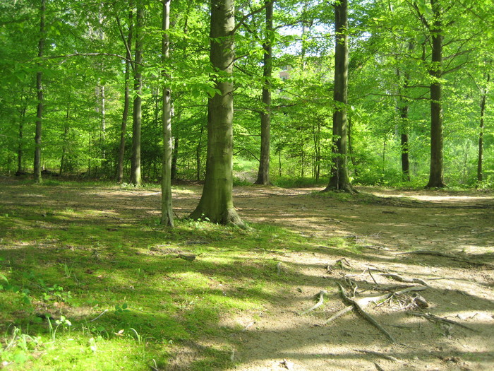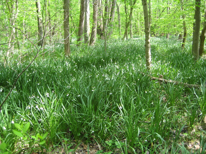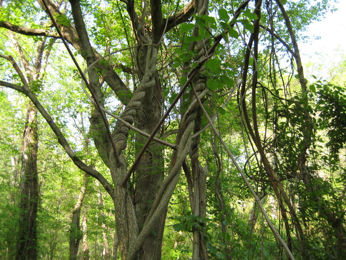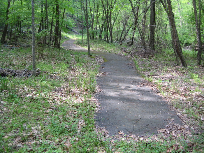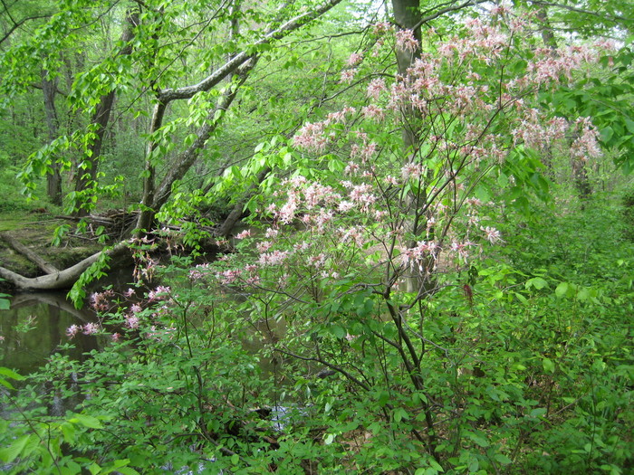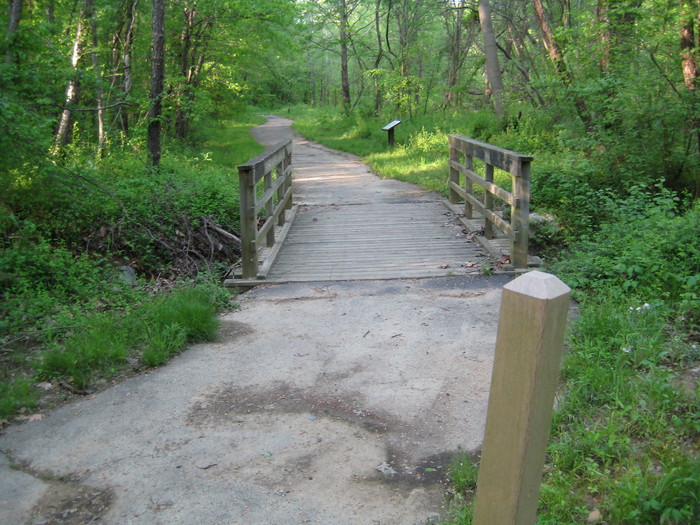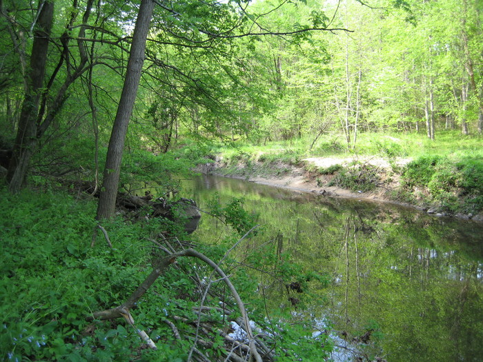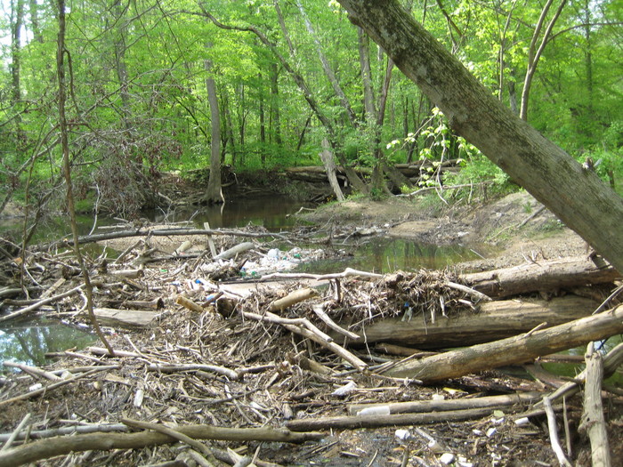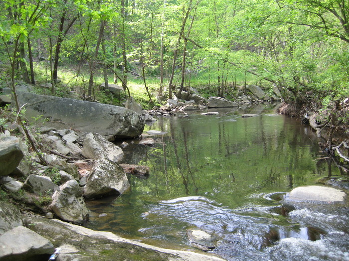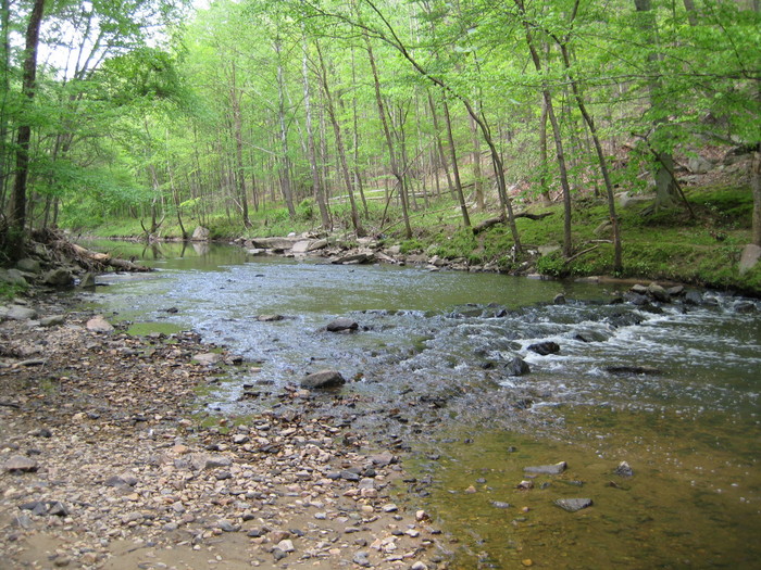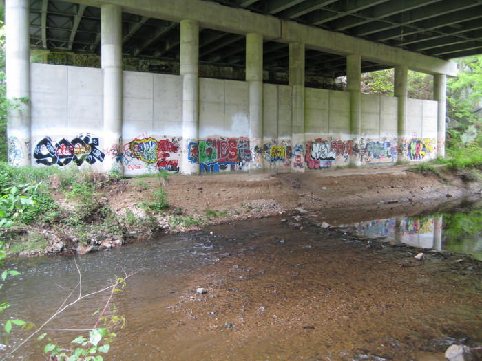 2 May 2008: Walked upstream from the north boundary of the Engineer Proving Ground (EPG) to Old Keene Mill Road along the main stem of Accotink Creek. Between the EPG and Hooes Road, Accotink Creek flows through an area of many large rock outcroppings and exposed bedrock. In places the banks show the typical steeply eroded sides. In many other places where the water flows over rock, there is little erosion visible. There are long stretches of slack water here. Below Hooes Rd, there are none of the logjams of erosion-toppled trees so common along other sections of Accotink Creek, and above Hooes Road there are only two. Buffer is good here, with only a few houses visible atop the high bluffs which line the creek along much of this section. Virginia bluebells and paw paws are prevalent here, but so are many alien invasive species, such as Chinese wisteria, Oriental bittersweet, and Japanese stilt grass. There is also an unidentified flowering bulb that covers large areas and must also be an invasive alien species. Land ownership on both banks below Hooes Road is a patchwork of park and private land. There are no signs to mark any boundaries and few indications of private use of land here. One sign of prior private use is an abandoned in-ground swimming pool, sitting completely alone in the midst of woods below Hooes Rd. There is little trash below Hooes Rd, but there is some roadside dumping at the Hooes Road bridge. Also at the bridge, a nasty invasive alien species, Japanese knotweed, has established itself. The Franconia-Springfield Parkway (7900) bridge is just above Hooes Rd. Between the two, a small tributary joins from the east. Previous attempts to reinforce its course are failing, with much riprap displaced and geotextile exposed. Also between the two bridges is an especially large rock outcropping which seems to be a gathering spot for the young, judging from the wear visible on top. It is kept reasonably clean, however, at least on this day. The 7900 bridge abutments are used as colorful graffiti walls, but none seems to be offensive. At Hooes Rd, a paved trail begins on the east bank which leads upstream, then eastward into the Greensprings retirement village. Above 7900 there is also a paved trail along the west bank. This is part of the Cross County Trail (CCT). The pavement becomes gravel nearing Old Keene Mill Rd. Major changes are coming to the CCT here. The pavement is to be extended and rerouted through the woods and a concrete bridge to be added just below the Old Keene Mill Road bridge. Additional information on CCT paving Two eastern tributaries join Accotink Creek between 7900 and Old Keene Mill Rd. One is Calamo Branch. The other, unnamed, also has a failing reinforcement project. Three tributaries join from the west along this stretch, all unnamed. A gas line cut crosses the creek here. There is a significant amount of trash in the woods below the cut, carried there during flooding. There is also a sewer line cut, not as regularly maintained as some, which has evolved into a series of pools. Buffer is also good here, with only a few houses to be seen atop the eastern bluffs. The west bank is flatter and broader here than below Hooes Rd. The entire west bank is park here, as is the east bank near Greensprings. There is little Chinese wisteria above Hooes Rd, but all other invasive species are the same. This section of the creek is largely spared dense thickets of multiflora rose, but it is present. Photos: