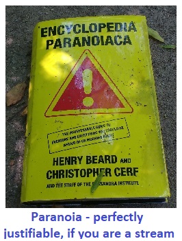 Above Platten Drive, the tributary is confined to a fenced off concrete channel on the Oak Creek community property, and is mostly mowed to the banks. Accumulated sediment has caused a little marshland to form in the channel at Platten Drive. Above Blake Lane there is a short stretch of the tributary that is not confined and has decent buffer as it flows through a private lot and the Edgemoor community property. Further upstream, the tributary is again confined to a concrete channel which is mostly mown to the banks. An eastern branch of the Draper Drive tributary feeds in through an adjacent stormwater pond here after traveling three blocks through storm drain pipes. An odd find in this channel was a discarded box of books, prominent among which was the "Encyclopedia Paranoica". But is it truly paranoia if you are a stream and are variously forced into concrete channels and pipes, used as a dumping ground, deprived of trees lining your banks, force-fed by storm drains, plagued with invasive species, eroded and choked with sediment? Could a stream be forgiven for thinking "they" really are out to get you? The last upstream trace of open water is a steady trickle running in the concrete ditches of the stormwater pond at Fox Spring Court on the Hunter Crossing community property. The eastern branch can be found above ground by looking north of Leamore Lane on the property of the Edgemoore, Oakton Plantation, and Old Courthouse Woods communities. The lower portion is mowed to the banks and lined with recent-looking stones. Farther upstream, the streambed is more natural and enjoys a narrow thread of wooded buffer, although dominated by invasive alien species. The last upstream water is found in a pair of stormwater ponds. No fish are found in the eastern branch. See all the July 2018 Draper Drive tributary photos at Shutterfly.com Ranger Road tributary July 2, 2018: Walked along the Ranger Road tributary of Accotink Creek