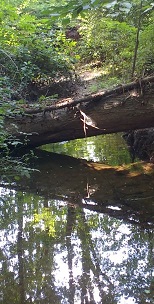 The North Fork enjoys wide forested buffers along its lower length in Ranger Road Park, Stafford Park, and Willow Woods Open Space. There are some places where the buffer is narrower on one side or the other, particularly on the Ranger Road side near the mouth, and where a few property owners have mowed too near the banks. Upstream from Plantation Drive, the trees appear to be younger. The buffer and the cooling shade provided by trees may contribute to the abundance of small fish in the North Fork. Swirling schools are visible nearly every step of the way, as far upstream as Howerton Drive. The 12-inch drop at the Plantation Drive culvert would seem to be impassible, but fish may manage to get by during high water. The extended portion contained in storm drains must also be too daunting for fish to pass except when swept downstream through the pipe by high water. The amount of trash is moderate along most of the North Fork. Invasive alien plant species are present all along the North Fork, including Porcelainberry, Oriental bittersweet, Japanese stilt grass, Bush honeysuckle, Multiflora rose, and more. Infestations tend to be lesser in the shadier areas. Invasives are more prevalent in the younger forest areas in the parks upstream from Planation Drive. Just as streams flow downhill, so do sewer pipes. A cleared strip along the path of the sewer line runs next to the North Fork along its lower length. The cleared strip is often the path of least resistance for walking, as there is no formal trail development along the creek and informal trails are largely missing as well. This appears to indicate this area of the North Fork is little-visited by its neighbors despite being in public parks. It's true that formal public access is limited to a few points, notably at the mouth in Ranger Road Park and at Stafford Road Park. Stream stabilization projects cover the entire lower length of the North Fork. U-shaped rock vanes one after another turn much of the stream into a series of stepping pools. These vanes may have been designed with fish passage in mind, as they are low and provide gaps that facilitate swimming through. There do not seem to be stream restorations upstream from Chain Bridge Road. Between Eaton Place and Chain Bridge Road, the North Fork is confined to a storm drain. Upstream from Chain Bridge Road, the North Fork flows almost entirely through private lots, with short segments in Cobbdale Park and the common property of The Assembly community. Buffer is a mix here, with many yards mowed to the bank, but the last few upstream lots are large and wooded. The houses along the south side of Howerton Ave have the North Fork as a "moat", flowing through their front yards and crossed by private bridges. One lost little branch feeding the North Fork can be found in the open only for a 200-yard segment in a concrete channel alongside Egan Drive. See all the June 2018 North Fork Photos at Shutterfly.com The North Fork was the focus of a contentious project in 2007 to install playing fields that replaced a formerly wooded area. MORE HERE and HERE . The same year, there was also a fish kill caused by careless swimming pool discharge. MORE HERE Draper Drive Tributary July 2, 2018: Walked upstream along the Draper Drive tributary of Accotink Creek This unnamed tributary is referred to by the name of a nearby street and park. The tributary joins Accotink Creek in Draper Drive Park, just north of Fairfax Blvd in Fairfax City. The tributary runs parallel to Draper Drive along its lower length, so buffer is limited along the eastern bank. On the western bank, buffer stretches off into the distance, in the parks flanking Accotink Creek. Shortly upstream, buffer narrows on the western bank as well, constricted by the playing fields and parking lot of Draper Drive Park. There are stoneworks from stream restoration projects all along this lower section of the Draper Drive tributary. Not all of them have fared well, having been bypassed in paces by the stream finding its own course and resuming the erosion of the banks that the projects were intended to prevent. Fish are common along the lower Draper Drive tributary, as well as damselflies. Invasive alien plant species are prevalent here, such as Porcelainberry, Multiflora Rose, Bush Honeysuckle, and Oriental Bittersweet. Trash is moderate here and along most of the Draper Drive tributary. The point where the tributary passes under the Draper Drive Park entrance (Beech Drive) also marks its last upstream point in the City of Fairfax. Everything upstream from here is in Fairfax County. The culvert under Beech Drive is an extended one; the stream disappears about 50 yards upstream, entering drains under the lawns of Yorkville Apartments. Above Beech Drive, the tributary is confined to a fenced-off concrete channel. The channel is mown to the banks, but there is some sediment and gravel substrate and fish are making a living here. Above Kingsbridge Drive, the tributary is on the grounds of the Hawthorne Village Condominiums. The channel is fairly natural here, but buffer is quite narrow or absent is spots and many large stones have been laid in the streambed as reinforcement. Above Hawthorne Village, Draper Drive tributary flows through Mosby Woods Park. Buffer is broad here and the channel is noticeably wider and more natural, but fish seem oddly few in number. The park evidently is popular, as in some places, the ground beneath the trees is worn bare by visitors. Mosby Woods Elementary School is adjacent to the park and tributary at Five Oaks Road. Just above Five Oaks Road, the tributary flows through Five Oaks Landing community property. Here there is a well-maintained man-made pond named Shadow Pond. The stream is not so well maintained, as trash is much more visible here than other places along the tributary. The tributary is smaller, slower, and has more of a muddy bottom here. Buffer is good along the community property, but there are many invas
