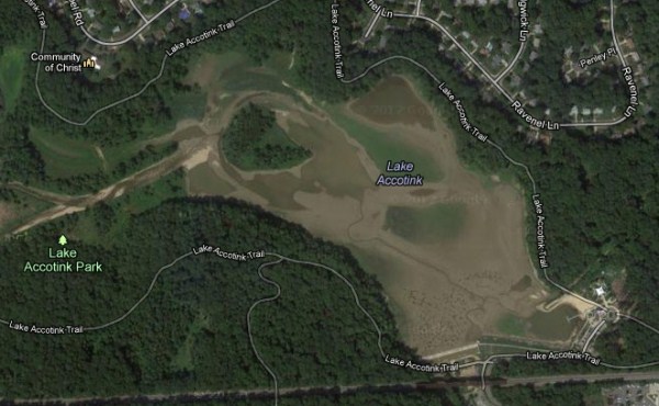 Google Map image of uncertain date, showing Lake Accotink drained.
