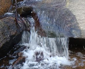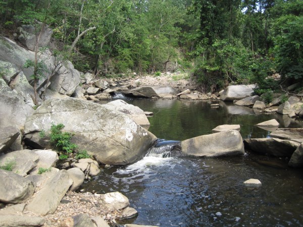 View of Accotink Creek above Fullerton Road running over boulders and bedrock