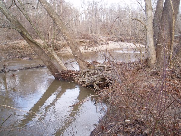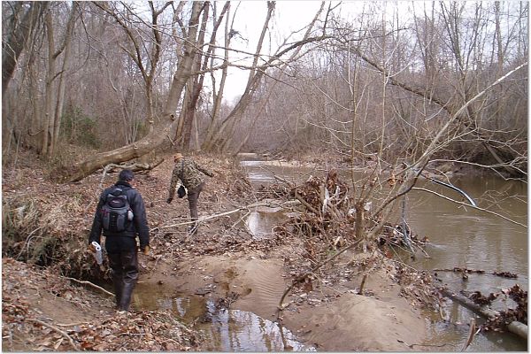 Location: Lower Accotink Creek, walking upstream from the northern boundary of Fort Belvoir at Telegraph Road, over four miles to the southern boundary of the Engineer Proving Ground, just north of Fullerton Road. Observations: Beaver dams, red-tailed hawks, pileated woodpeckers, the fresh tracks of deer, fox, and raccoon within earshot of the drone of I-95 traffic give hope for the health of the neglected, overlooked stretches of Accotink Creek. Yet, alongside these are the clear signs of ill health - mounds of trash, undercut stream banks, silt-laden water, toppled trees caused by excessive runoff, and innumerable invasive multiflora rose bushes and vines. Conditions on this stretch of Accotink Creek range from a dumping grounds to "no-worse-than-usual" for a stream that is quickly filled to the banks with storm runoff. The Friends of Accotink Creek expect to undertake some of their initial cleanup efforts at sites found here. Duane Murphy and Philip Latasa were joined by Clair Garman, the webmaster for Friends of Accotink Creek and its sister group in Maryland, Friends of Sligo Creek www.fosc.org.