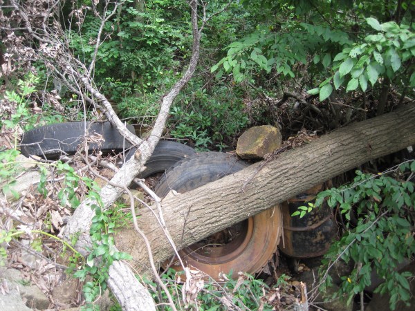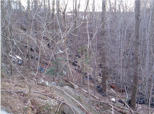 An illegal dump where we saw an estimated 500 tires,at least one battery and other trash in a ravine where a storm drain outfall drains into Accotink Creek? This steep ravine near an industrial park on the west side of Accotink Creek, north of Fullerton Road, can become a mosquito breeding grounds when the weather warms.
