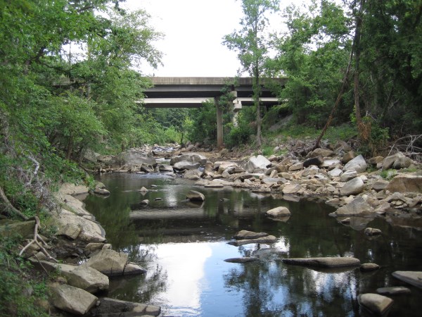View of Accotink Creek below Fullerton Road bridge. The creek runs over boulders and bedrock.