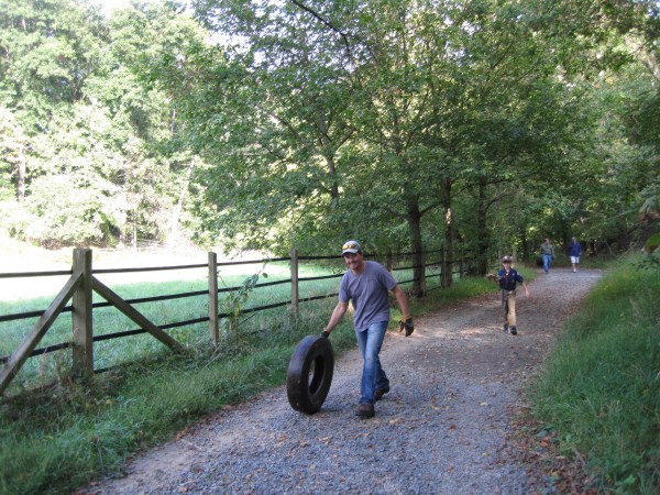 Heavy overnight rains left the ground a bit muddy and slippery, but the clouds were parting and the sun coming out as we got underway. We passed both the spring and fall 2012 cleanup seasons without getting rained on! Our first site, King Arthur Road, no one had registered to participate, but the volunteers began to appear, and we saw a turnout of nine. Andres Ploompuu and Philip Latasa represented FACC. Our most unusual find here was a "dance pad" for a video game. At our second site, Little River Turnpike, we had only one volunteer registered, but several more again materialized, for a turnout of seven. Flint Webb and Bill Nell joined us after attending the Green Breakfast. Ted Welch also joined to represent FACC. One young volunteer engaged in extended battle with a large tarp deeply embedded in the gravel and finally vanquished it. Our most unusual item found here was a decrepit wheelbarrow. Bill debuted his impressive sculpture made entirely of trash found on our first day of cleanups. We may need to have a contest to name it.
