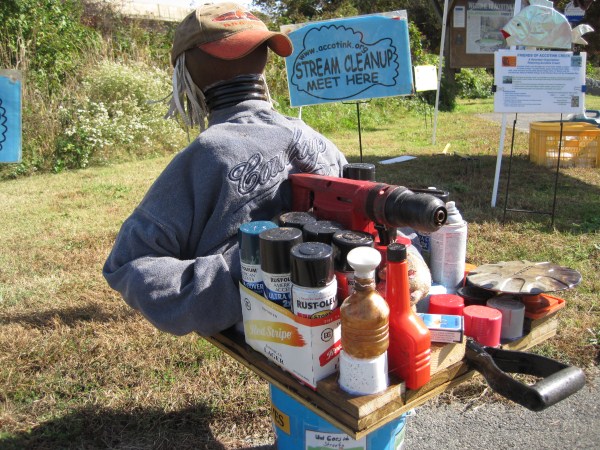 Heather Breiner, Bill Nell, Olivier Giron, and Philip Latasa represented FACC at our first two cleanup sites. At our Fairfax Blvd. site, we had mild sunny weather and nine volunteers. The Adopt-A-Spot volunteers of the Harley-Davidson dealership were also at work, getting trash off the street before it reached the stream. Thanks, Harley-Davidson! Our most unusual find here was a rusty bicycle. At our Chain Bridge Road site, sunny skies turned cloudy and rain threatened, but stayed away. Our small turnout of four volunteers found trash conditions to be unusually bad for this headwaters location. We would have needed dozens of volunteers and many hours to make the kind of difference we would like to. We took a break from our efforts for a visit from the Clean Coast Project art group, who brought two of their trash sculptures to display and engaged in discussion of their efforts to call attention to trash issues. Our most unusual find at this site was a GPS unit – perhaps it took a wrong turn into the creek? As we arrived at our Old Lee Hwy site, the weather was clearing, but was too breezy to raise our tent. Otherwise, conditions were excellent. Olivier and Bill had to leave us, but Roger Diedrich joined to represent FACC. Five volunteers also came out. Trash conditions were pretty bad here also. As usual, we found the bottom of the creek carpeted with golf balls from the adjacent Army-Navy Country Club. Unusual finds here included a new paint roller, a bicycle in such good condition we were able to ride it around, and a shopping cart a team of volunteers labored hard to excavate from the streambed.
