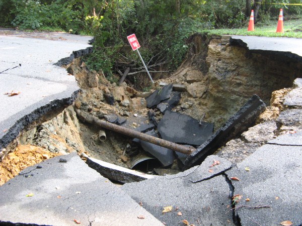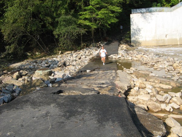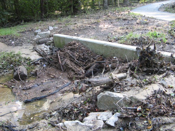 Washout of new trail pavement below Lake Accotink dam spillway.