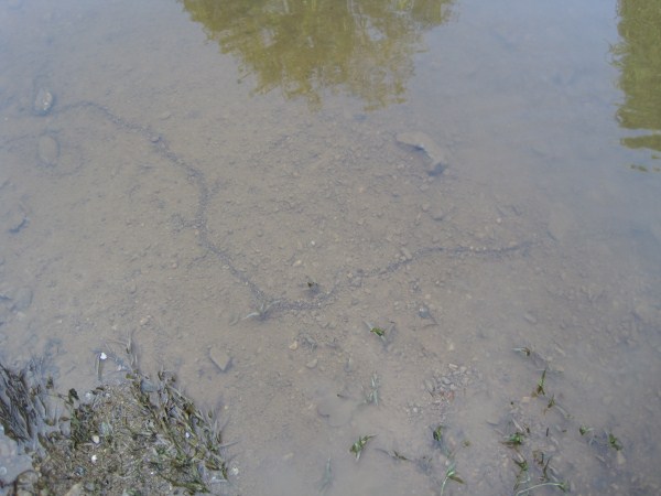 On Saturday, September 10th, 2011, closure of the park entrance for flood damage repairs fored us to cancel our scheduled stream monitoring session. Instead, we turned the morning into a wildlife rescue operation for creatures displaced from the creek by the floods. We rescued 60-plus freshwater river mussels Eliptio Complanata which had been left stranded above the waterline. In the water mussels are capable of moving by opening their shells and laboriously dragging themselves along with their one "foot". Out of water all they can do is shut themselves up tight and hope to conserve moisture until the water rises again. Or they can use their foot to burrow down seeking the water under the sand. We were gratified to find that there were numerous juvenile mussels found. We had previously feared that no mussel reproduction was occuring in Accotink Creek because we had encountered only adults, but no juveniles. We also managed to help out a few fish stranded in puddles.