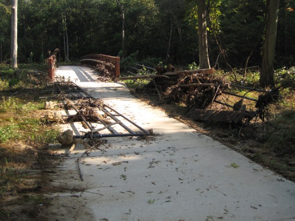 Cross County Trail bridge railings collapsed by flooding - again.