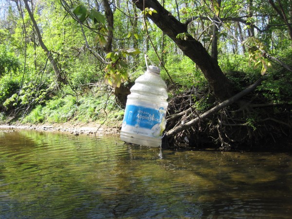 Water pollution becomes air pollution - a bottle is left hanging high and dry after flooding.