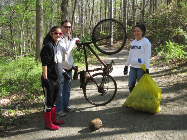 We again benefited from sunny weather, but parking was tight in Wakefield Park due to the many baseball games going on. We hope no volunteers became discouraged and turned back. We also hope no volunteers were unable to find their way due to a bad directions link on our website. Turnout was good, with 34 volunteeers, including National Honor Society members from Edison High School. Three volunteers, overcome with zeal, stretched a bit too far and got dunked up to their knees or beyond. The cost was worthwhile for one wet volunteer, who retrieved a bicycle still in good condition that another volunteer will donate to World Bicycle Relief. An mysterious find was a pile of five hypodermic syringes, still in sealed packaging. Surprisingly, the morning cleanup organized by Lake Accotink Park had a turnout of ony about 50, far below the hundreds who usually show up. Elsewhere in our watershed, Jack Buckley, the protector of Hunters Branch, led the cleanup of that tributary, while Rick Ayers organized the cleanup of Southside Park in Vienna along the Bear Branch tributary. Unfortunately Southside Park also encountered parking conflicts with baseball.