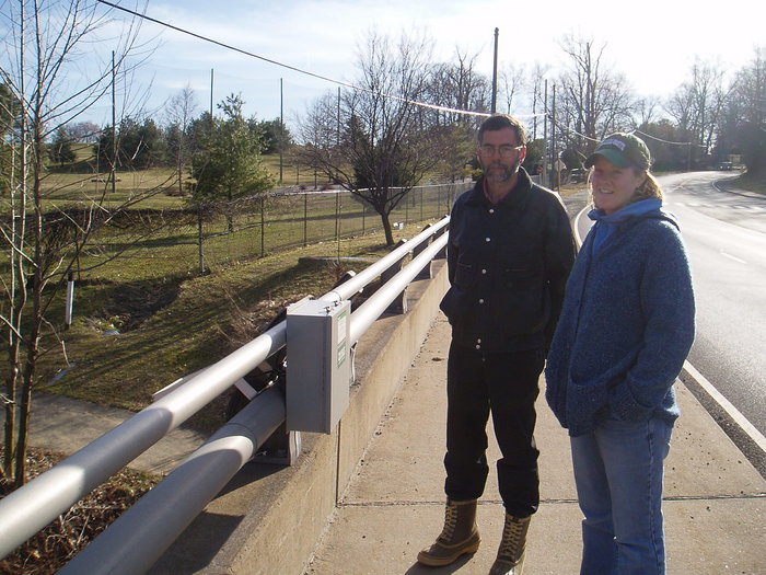 Philip Latasa, Friends of Accotink Creek and Jeanne Classen of Virginia Department of Environmental Quality (DEQ) standing on Old Lee Highway Bridge examining the solar powered EPA monitoring data collection device