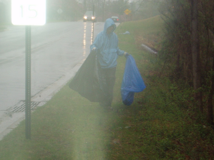 A Member of Friends of Accotink creek dressed well for the rain, picking up trash along a storm drainage ditch at Wakefield Park entrance.