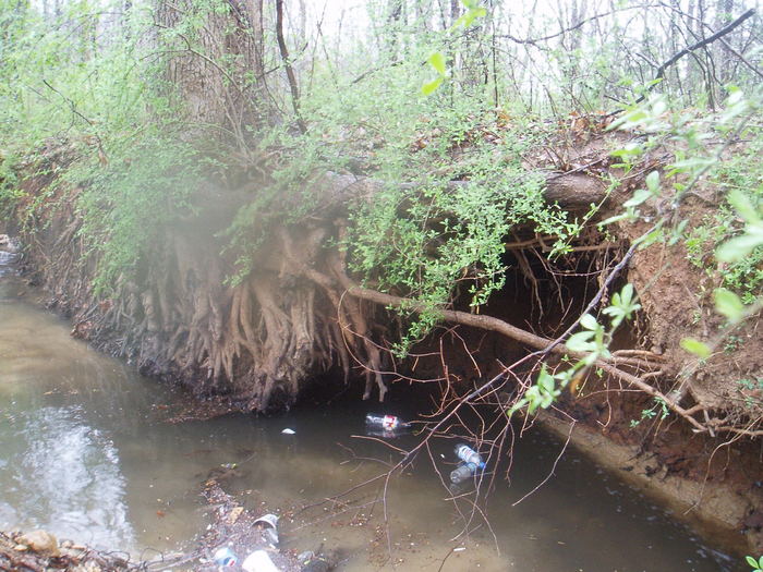 Storm drain ditch undercut a huge tree that is about to fall with fresh trash that just came out of a storm drain.