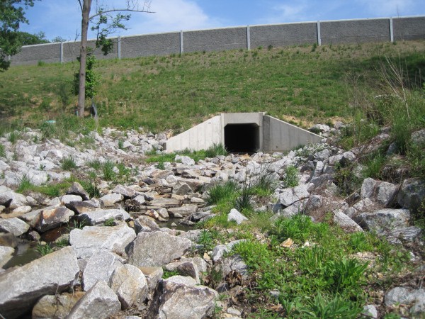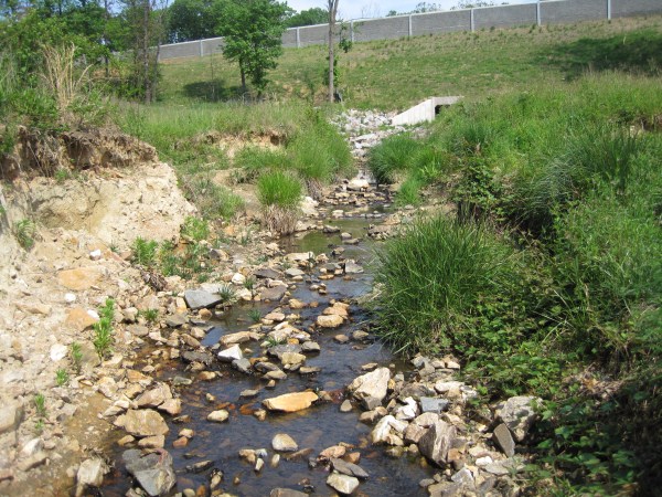 Here Wakefield Run emerges after flowing under the Beltway. All this stone was an attempt to reinfoce the stream banks, but it needs to be done better. All the trees above the culvert were cut down to make room for the 495 Express Lanes project.