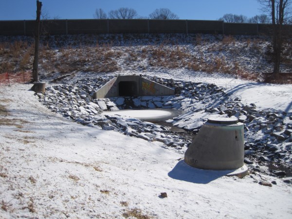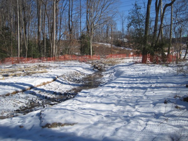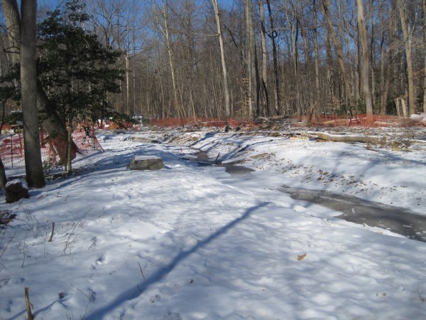 Berm allows equipment to work at the mouth of Wakefield Run. Wakefield Run, January 29, 2014