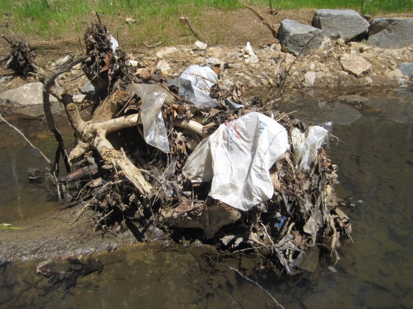 Embedded root wad becomes habitat for the most common creature in our waters "Saccus plasticus"